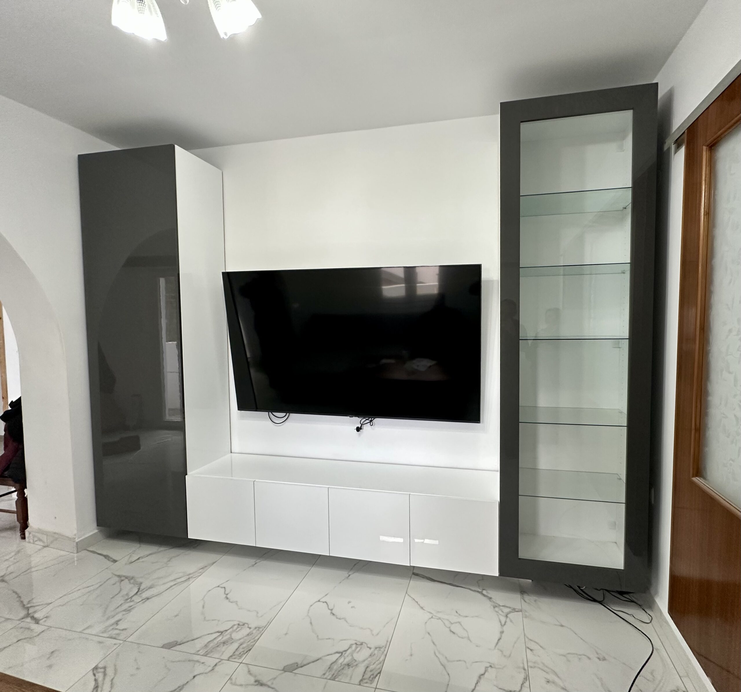ΣΥΝΘΕΤΟ TV MDF ΓΥΑΛΙΣΤΕΡΟ ΜΕ ΒΙΤΡΙΝΑ ΚΡΕΜΑΣΤΗ